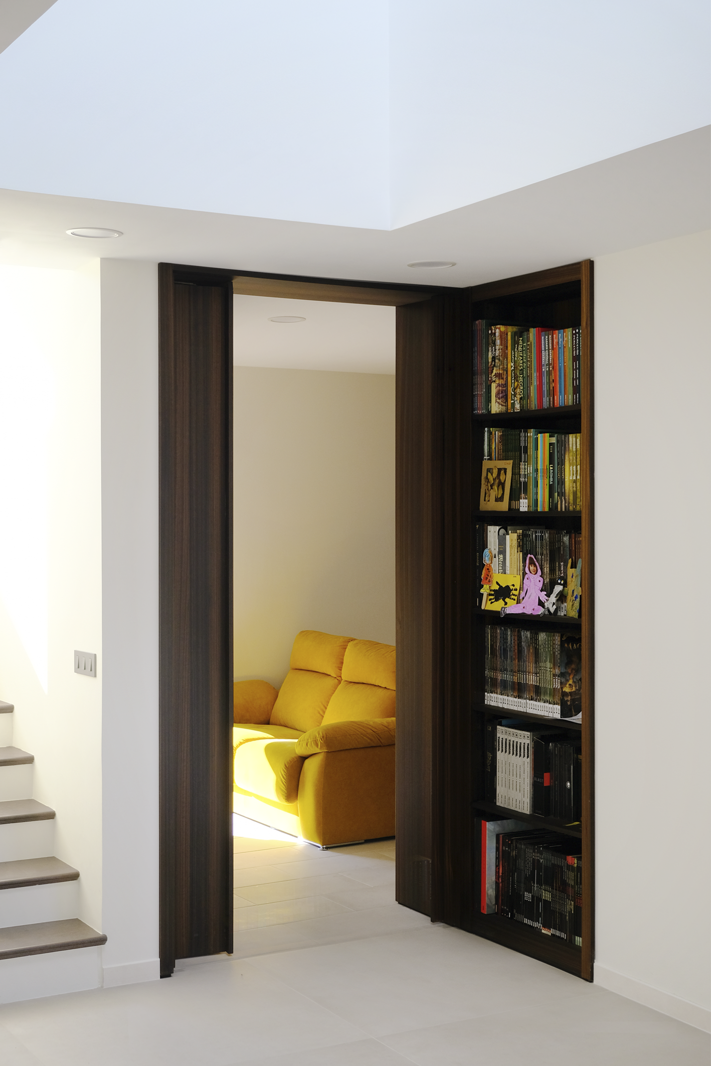 El espacio en la planta baja se abre en diagonal desde un espacio central a las distintas estancias, cocina, biblioteca, despacho y salón. Se busca preservar la autonomía de esas piezas sin renunciar a que esten relacionadas, un equilibrio entre un espacio abierto y diferenciar cada estancia. La generosidad en las dimensiones de ese distribuidor o eespacio disponible en planta baja favorecen la flexibilidad y la espontaneidad en el uso. Actualmente es el espacio de juego favorito de los dos hijos de la pareja.